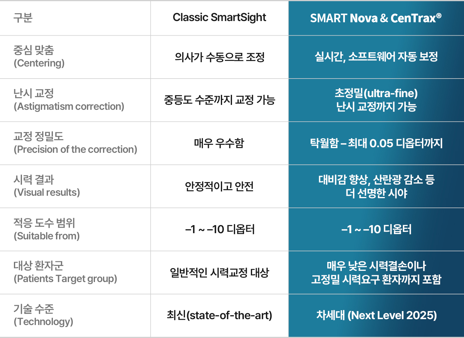 SMART NOVA는 CenTrax® 시스템과 AI 기반 실시간 안구추적기술이 결합된 플랩리스(Flapless) 스마일 수술로 ESCRS 2025 Copenhagen에서 ‘환자 중심의 미래 비전 교정(Patient-First Summit)’으로 공식 소개되었습니다.
