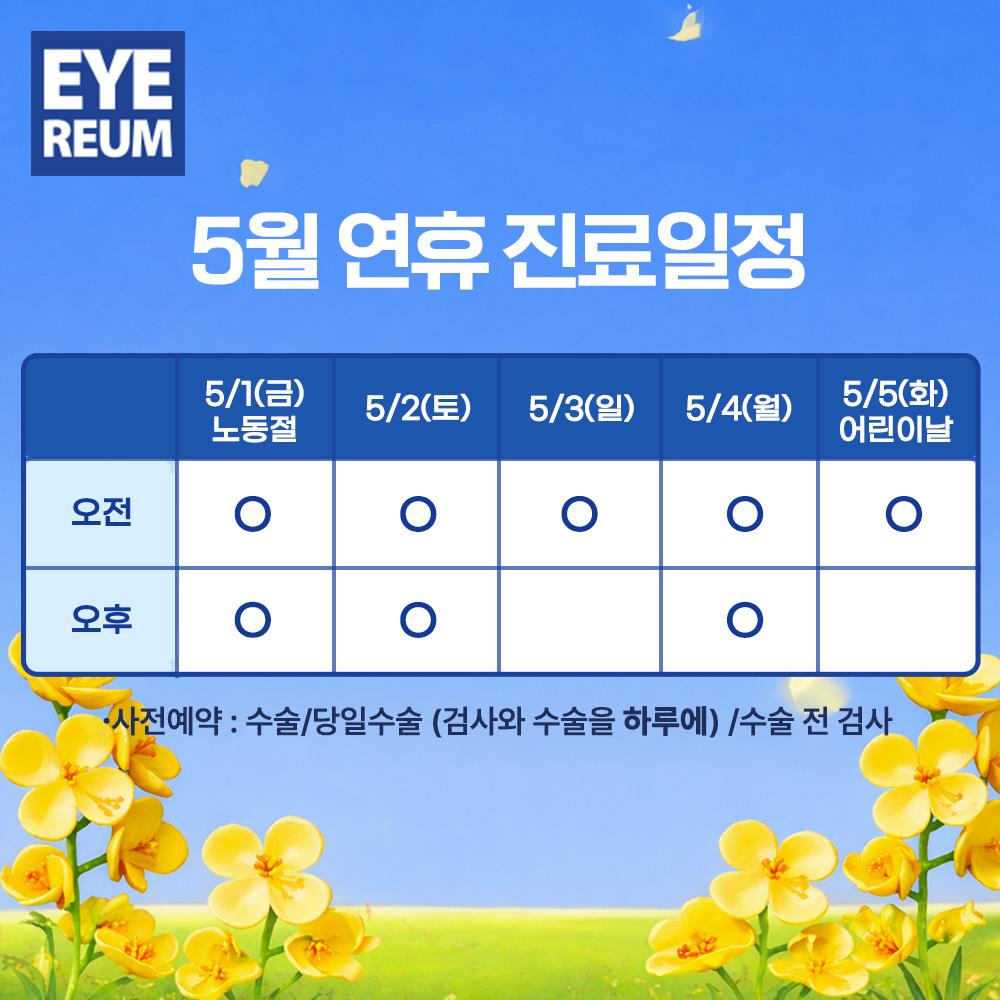 또한 5월 3일, 5월 5일(어린이날)에도 시력교정술 검사 및 수술 예약이 가능합니다.
